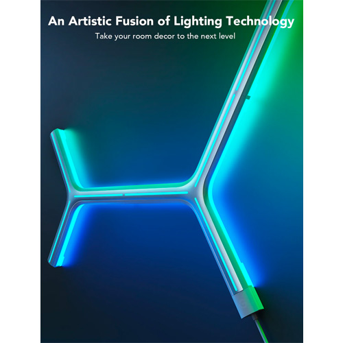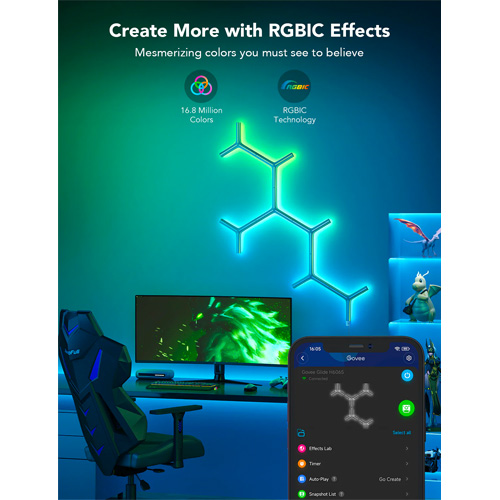 Bekijk je kamer met de Govee Glide Y Lights; de Y-lampen maken gebruik van RGBIC-technologie om de meest sfeervolle lichtpatronen te creëren. Bedien de Govee lichtpanelen met je smartphone; van met je stem via Google Assistant van Amazon Alexa.