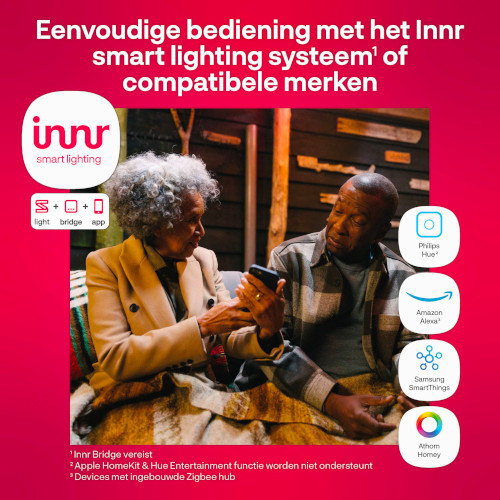 Set van 10 slanke kleurenlampen die werken met Zigbee en bluetooth waardoor je ze aan je hub kunt koppelen. Geen hub? geen probleem dan koppel je ze direct op je smartphone. Slimme kleurenlamp met de meeste opties.