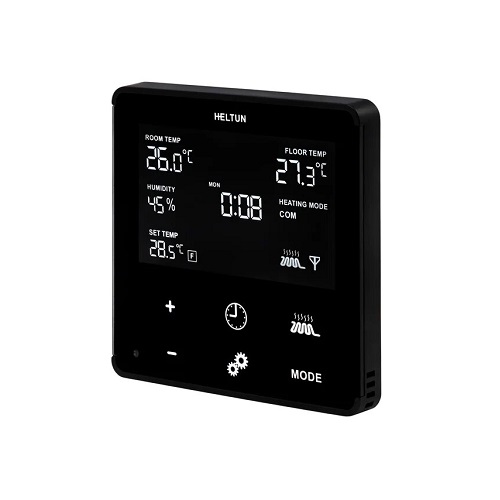 Slimme thermostaat voor het aansturen van elektrische (vloer)verwarming; bijvoorbeeld in de badkamer. Met ingebouwde vochtsensor.
